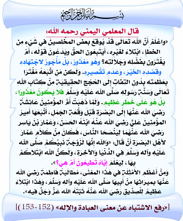 «واعْلَمْ أَنَّ الله تَعَالَى قَدْ يُوقِعُ بعضَ المخْلِصينَ في شَيْءٍ مِن الخطَإِ، ابْتِلاءً لغَيْرِه، أَيَتَبِعُون الحقَّ ويَدَعُونَ قَوْلَه، أَمْ يَغْتَرُون بفَضْلِه وَجَلاَلَتِه؟ وهُو مَعْذُورٌ، بَلْ مَأْجُورٌ لاجْتِهَادِهِ وقَصْدِهِ الخَيْرَ، وَعَدَمِ تَقْصِيرِهِ. وَلَكن مَنِ اتَّبَعَهُ مُغْتَرًا بِعَظَمَتِهِ بِدُونِ التِفَاتٍ إِلَى الحُجُجِ الحقِيقِيَةِ مِنْ كِتَابِ اللهِ تَعَالَى وَسُنَّةِ رَسُولِهِ صَلَّى الله عَلَيْهِ وَسَلَّمَ فَلاَ يَكُونُ مَعْذُورًا، بَلْ هُوَ عَلَى خَطَرٍ عَظِيمٍ. وَلَمَّا ذَهَبَتْ أُمُّ المؤْمِنِينَ عَائِشَةُ رَضِيَ الله عَنْهَا إِلَى البَصْرَةِ قَبْلَ وَقْعَةِ الجَمَلِ، أَتْبَعَهَا أَمِيرُ المؤْمِنِينَ عَلِيٌّ رَضِيَ الله عَنْهُ ابْنَهُ الحَسَنَ، وَعَمَّارَ بْنَ يَاسِر رَضِيَ الله عَنْهُمَا لِيَنْصَحَا النَّاسَ، فَكَانَ مِنْ كَلاَمِ عَمَّارَ لأهْلِ البَصْرَةِ أَنْ قَالَ: «وَالله إِنَّهَا لَزَوْجَةُ نَبِيِّكُمْ صَلَّى الله عَلَيْهِ وآله وَسَلَّمَ فِي الدُّنْيَا وَالآخِرَةِ، وَلَكِنَّ اللهَ ابْتَلاكُمْ بهَا، لِيَعْلَمَ إِيَّاهُ تُطِيعُونَ أَمْ هِيَ؟». وَمِنْ أَعْظَمِ الأَمْثِلَةِ في هَذَا المعْنَى، مُطَالَبَةُ فَاطِمَةَ رَضِيَ الله عَنْهَا بميرَاثِهَا مِنْ أَبِيهَا صَلَّى الله عَلَيْهِ وآلهِ وَسَلَّمَ، وَهَذَا ابْتِلاَءٌ عَظِيمٌ لِلْصِدِّيقِ رَضِيَ الله عَنْهُ ثَبَّتَهُ الله عَزَّ وَجَلَّ فِيهِ».