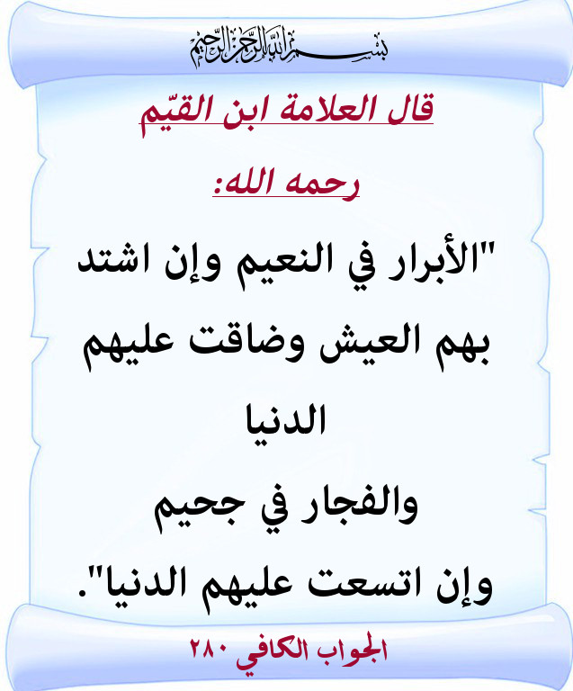 الأبرار في النعيم ؛ وإن اشتد بهم العيش، وضاقت عليهم الدنيا والفجار في جحيم ؛ وإن اتسعت عليهم الدنيا