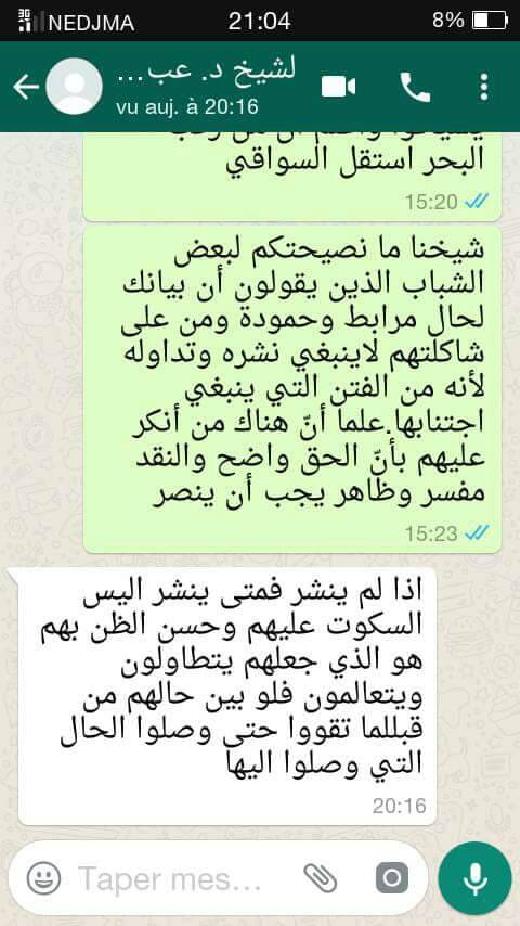 والله ما أدري كأنَّ الشخص المعني بهذه الفوضى أراد البروز والتصدر بطعوناته السافرة في حق خيرة المشايخ في الجزائِر وخارجها هكذا من غير تقدير للمفاسد المُهلكة التي تنجر من فِعلته الَتِي عصفت بعقول شبابنا وإخواننا !! .