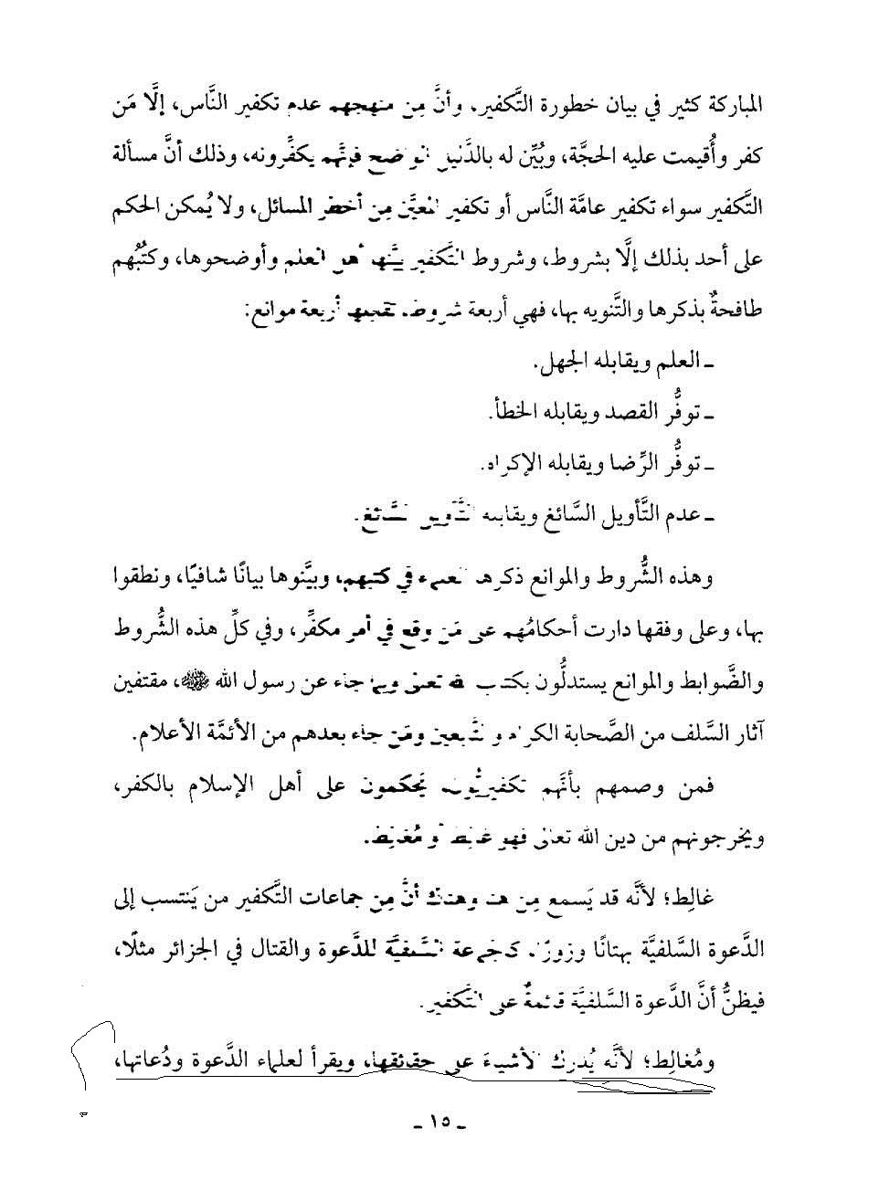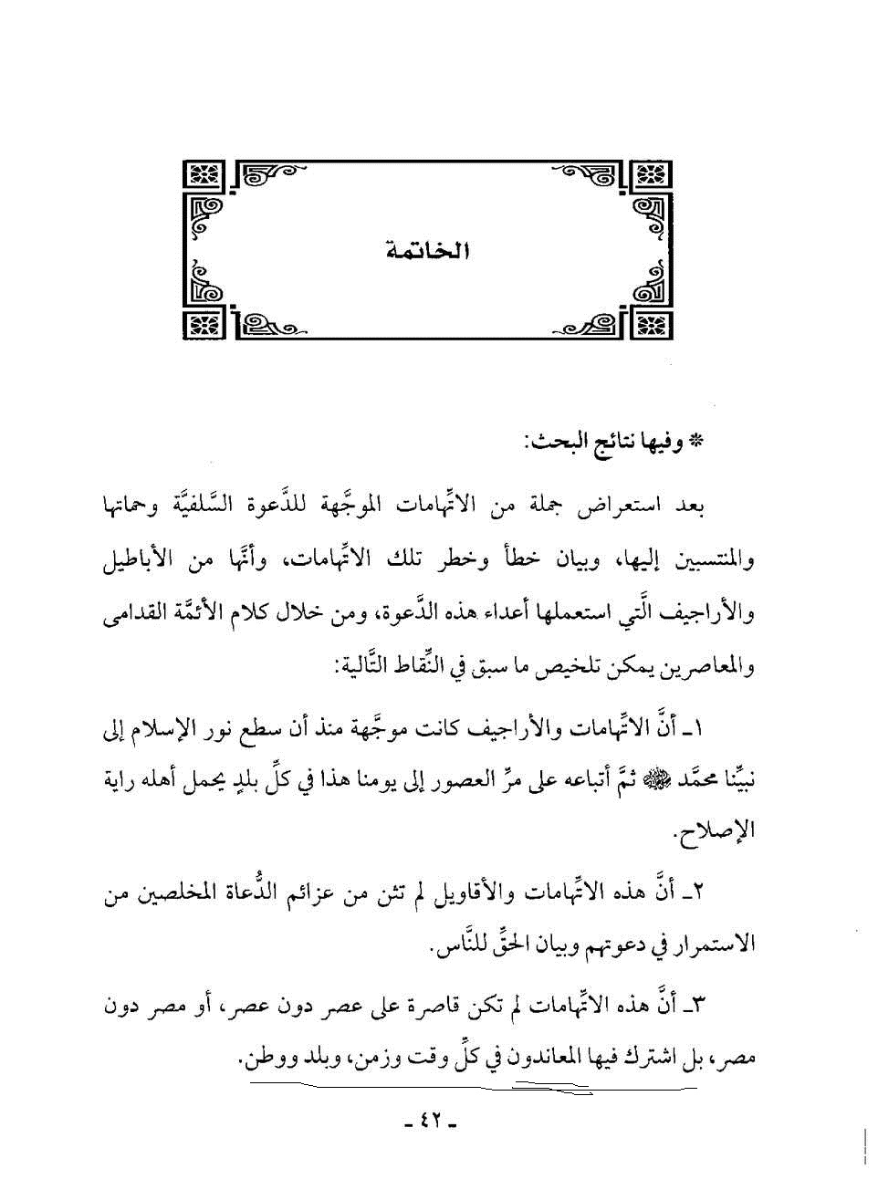 وكذلك ناقض نفسه في ( ص/ 42 ) في خاتمة الرسالة قائلا عن مصدر هاته الاتهامات للسلفية : « بل اشترك فيها المعاندون في كل وقت وزمن »؛ فأثبت أن من اتهم الدعوة السلفية بما ذكره في رسالته: معاندٌ، والمعاند أُتِيَ من سوء القصد لا سوء الفهم.