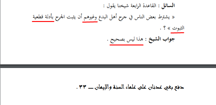 ومما أكثر المخالفون الثرثرة حوله أدلة المشايخ ، وادعاؤهم عدم جدواها وعدم بيانها لما وقع في فتنتهم هذه!، وقد أعماهم الهوى والتلبيس عن الأخذ بها يريدون من المشايخ الإتيان بالمعجزات من أجل توضيح الواضحات!، ظنا منهم أن هذا سوف ينفعهم في رد الحق وإسكات العلماء الربانيين الناصحين بعد أن أدانوا بعض إخوانهم الذين ظنوا فيهم أنهم معهم في المنهج ! فإلى القوم أزفّ جواب الشيخ العلامة ربيع بن هادي في كتابه : دفع بغي عدنان عن علماء السنة والإيمان (ص 30 و ص 32) ، مستدلا بأجوبة للشيخ ابن عثيمين رحمه الله في رده على سؤال حول الأدلة في الجرح لأهل البدع ولغير أهل البدع كما هو موضح في الصورتين (راجع المرفقات) ، فتمعّن أخي القارئ.