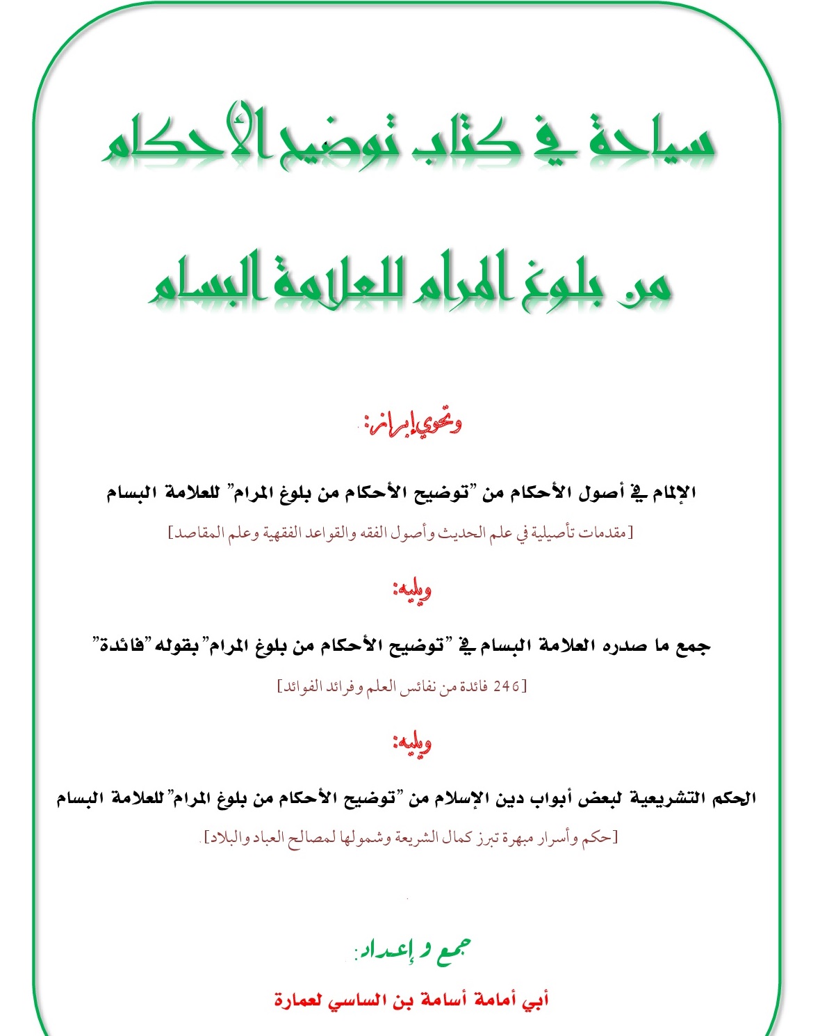 فهذه مجموع السلاسل التي كنت قد وضعتها على هذا المنتدى فيما يخص الفوائد المنتقاة من كتاب توضيح الأحكام من بلوغ المرام للعلامة البسام، قمت بجمعها وتنسيقها بعد تكرر طلبات الإخوة أن تكون مجموعة على شكل "بي دي اف" حتى يسهل الاستفادة منها، فأجبتهم رجاء النفع بها وحصول الخير لي ولهم من وراءها. وقد سميتها بـ :